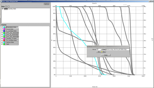 Above, you have clicked on the tab “Dose for a Given Volume” and entered .1 cc to determine the highest dose point. You can see that the “Brainstem + 3mm” gets 4616.5 cGy. This can be done for all volumes.