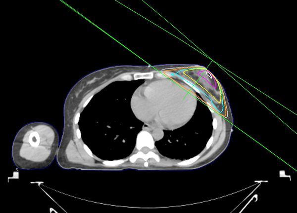 Treatment fields for Breast cancer are typically 2 tangent fields. The fields are angled slightly so there is a non-divergent border on the posterior side. This will help reduce unnecessary dose to the lung, heart, contralateral breast and other uninvolved areas. It is important to contour heart and lungs accurately so the Physician may see the dose to those structures and adjust fields accordingly, if necessary.