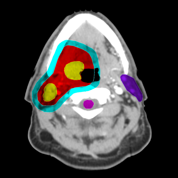 In this example, the dark purple area encompasses the parotid gland, one of the normal tissue