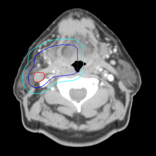 In this image, the red line delineates the GTV (Gross Tumor Volume), the dark blue line the CTV (Clinical Target Volume), and the light blue line the PTV (Planning Target Volume).