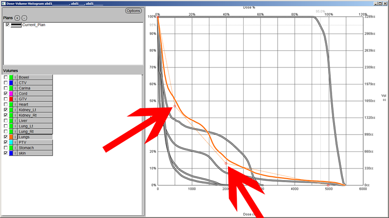 Click on the “Lungs” tab in the volumes window. This will isolate the lungs DVH and you will see a “User DVH bar.” Right-clicking your mouse will add points to the bar, and shift-right-click will delete them. Add two point to represent your goals of V5 < 50% & V20 < 15%.