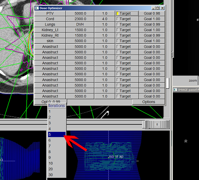 Back at the Optimizer; click the “OPT” button for a dropdown menu. This will ask you how many iterations you want to perform. Each iteration is a complex mathematical process attempting to bring you closer to your goal. Over optimization can be a common problem and can have negative effect on your final plan. Start slow and get a feel for the optimizer. To start, we will run 5 iterations.