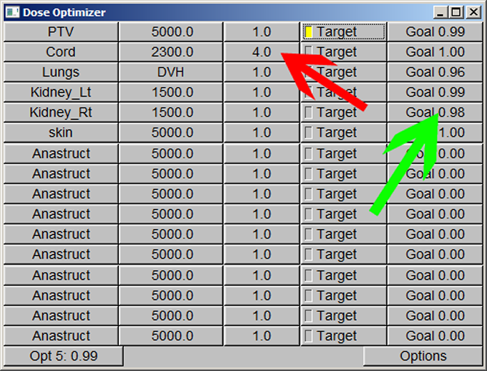 Before we run more iterations, we can make some changes in the optimizer. Raising the number in the 3rd column (red arrow) can increase the weighting to that structure, thus giving it more priority in the optimizer. Also, keep an eye on the Goal column (Green Arrow). That is the percent of the goal achieved. In the case of the right kidney, the optimizer believes it is giving you 98% of what you have asked. However, that remaining 2% might be the part that puts it over the limit. In some cases it would be wise to lower the target goal (1500) a bit lower.