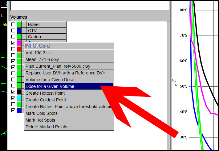 In the “Information” section of each Organ at Risk, you can find the structures Volume, Mean Dose, Volume for a Given Dose (Used to find V20 & V5), Dose for a Given Volume, and the Hottest Point Above a Threshold. We will use the “Dose for a Given Volume” to find out hottest points.
