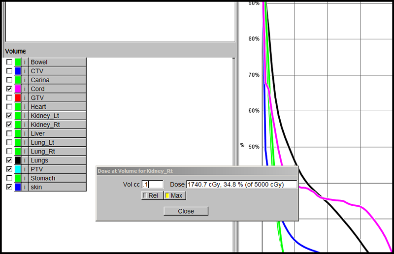 Just as we did with the Spinal Cord, we can click on the “I” (or Information) tab next to each Kidney Volume and enter .1 in the “Dose for a Given Volume” tab. This will give us or Max Dose Point. The Left Kidney and the Right Kidney are both under 1800 cGy.