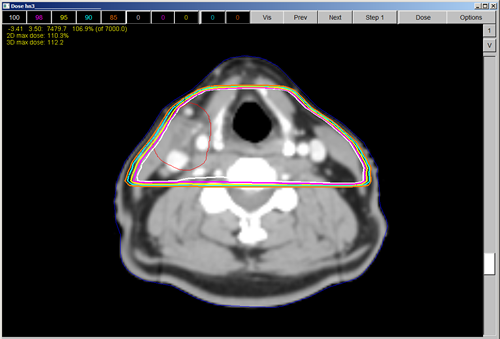 1) In the treatment plan above, the tumor volume in red was probably planned with; a) AP/PA Fields b) RT/LT Lateral Fields c) A Multi-field IMRT Arrangement d) Electrons