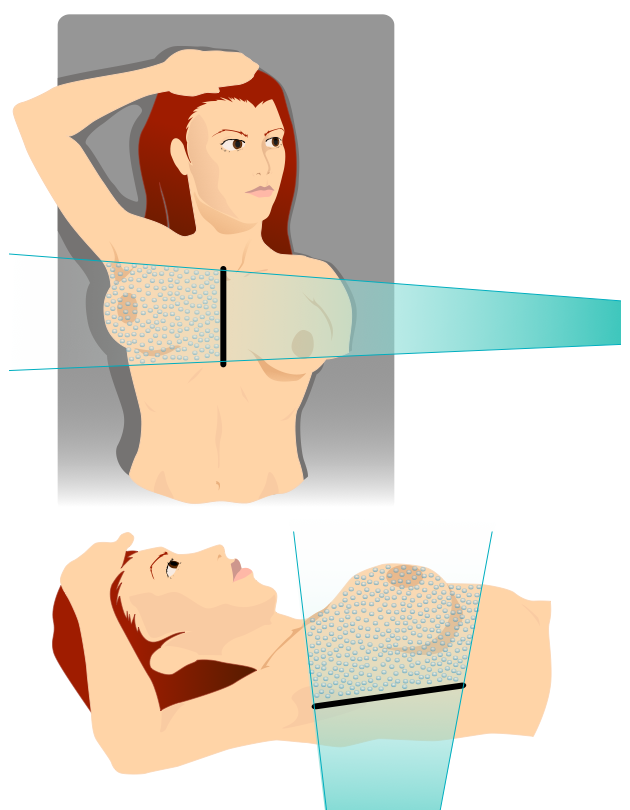 Typically, Breast Cancer patients are positioned on the treatment couch with either the ipso-lateral arm over the head, or both arms over the head. So, for a person with breast cancer of the right breast, the right arm would be positioned over the head (or both arms over the head.) This arm position insures that the contralateral arm does not get exit dose. Also, the head is turned slightly to the unaffected side. This will help to ensure that the chin is not in the treatment field.