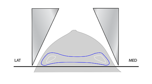 This image represents what a breast cancer treatment plan might look like if it was over wedged. Notice that the high dose lines are at the bottom or posterior part of the breast.