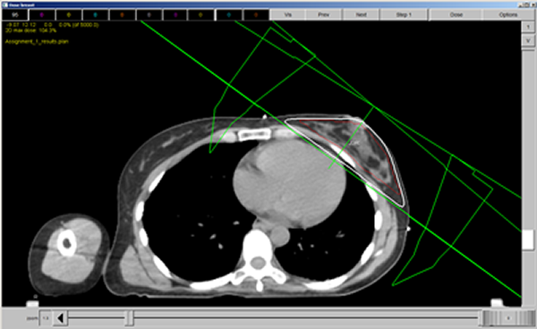This image illustrates complete coverage of the PTV by the 95% dose line on this cut. When in the treatment planning system, we will scroll through the plan and check the coverage of all of the cuts.