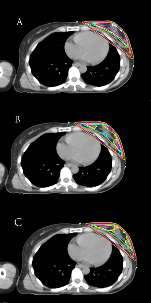 What set of isodose curves best displays homogeneous coverage for left-sided breast cancer? a) A b) B c) C