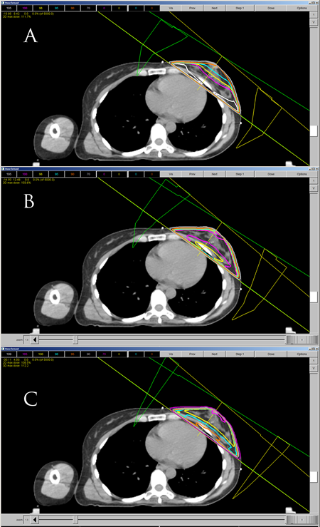 What set of isodose curves best displays homogeneous coverage for left-sided breast cancer? a) A b) B c) C